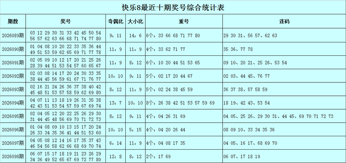 福彩快乐8第2026098期开出奖号:06 07 15 17 18 19 21 23 26 29 34 36 49 52 65 67 69 72 77 80,其中奖号奇偶比为12:8,大小比为8:12,包含2个重号17、69,包含连码06 07、17 18 19。